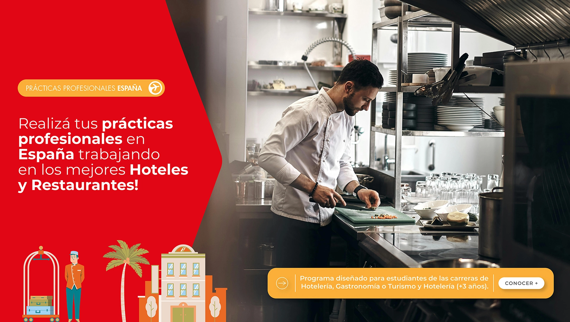 Programa diseñado para estudiantes de las carreras de Turismo, Hotelería y Gastronomía. Trabajá en España aprendiendo en los mejores Hoteles y Restaurantes y ganá experiencia laboral de tu rubro en Europa!