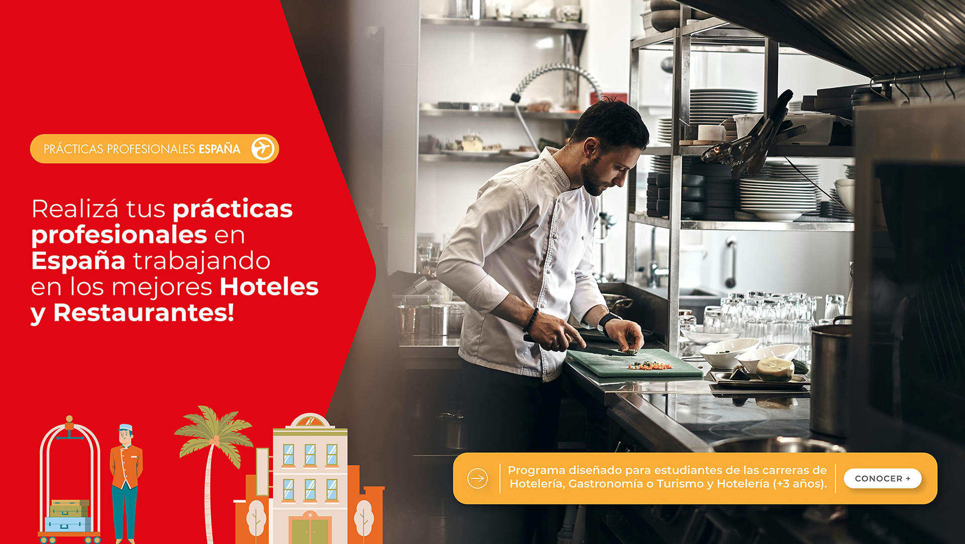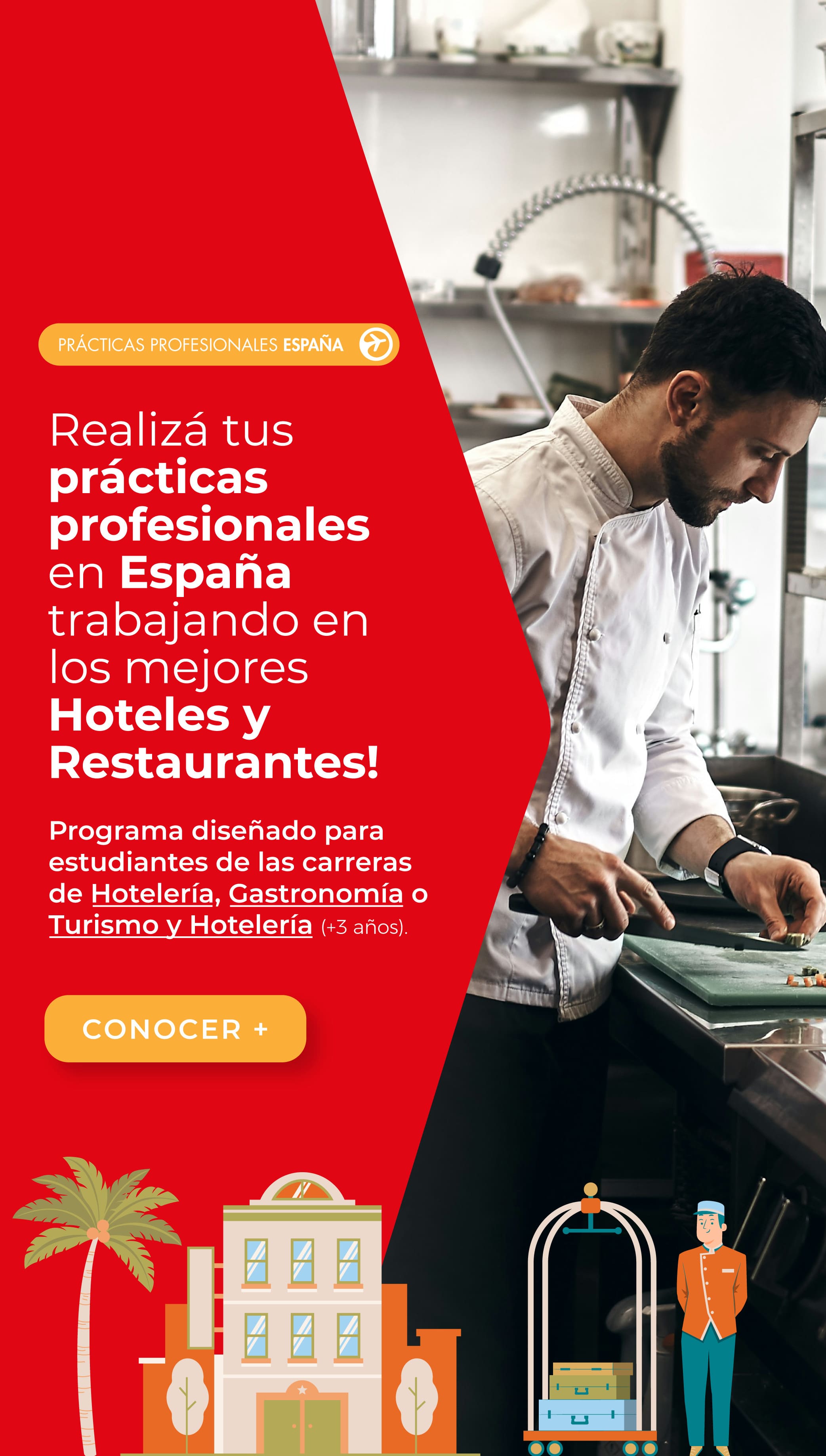 Programa diseñado para estudiantes de las carreras de Turismo, Hotelería y Gastronomía. Trabajá en España aprendiendo en los mejores Hoteles y Restaurantes y ganá experiencia laboral de tu rubro en Europa!